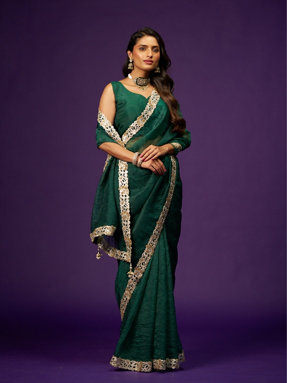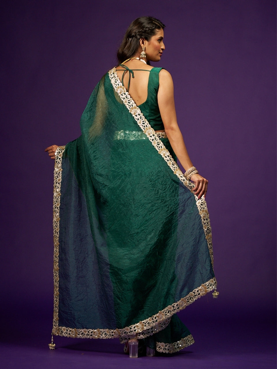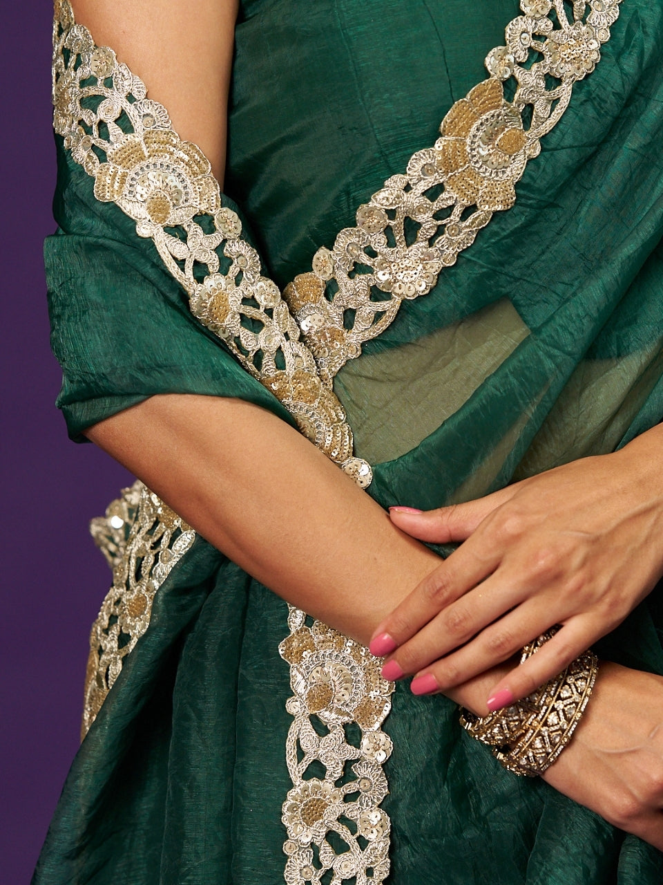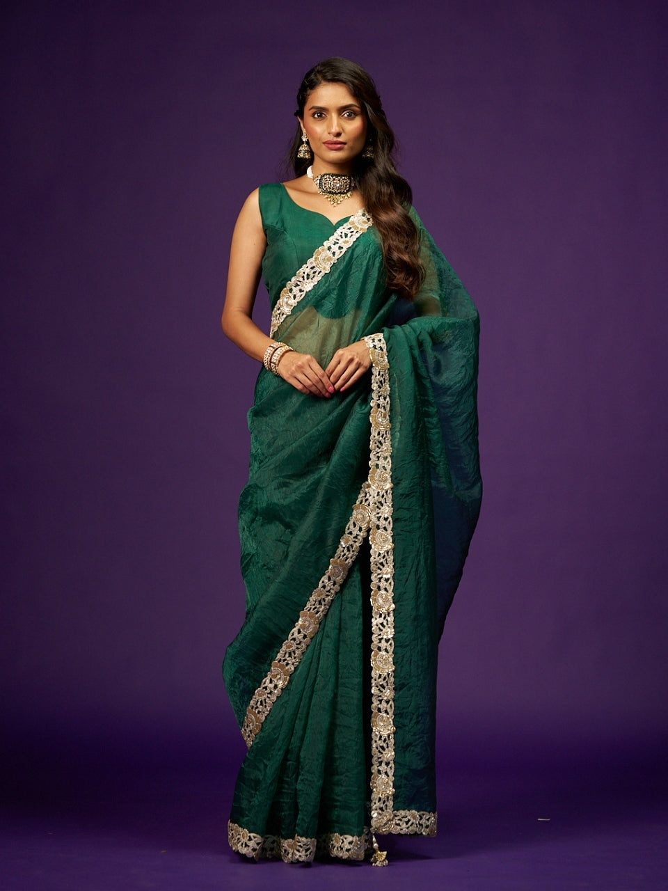 Enchant in Foxtons Green Shimmery Crush Tissue Saree