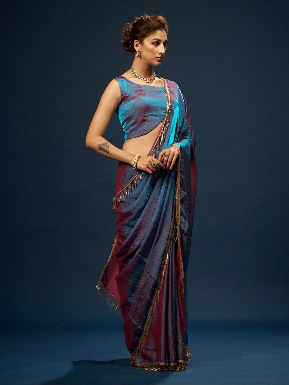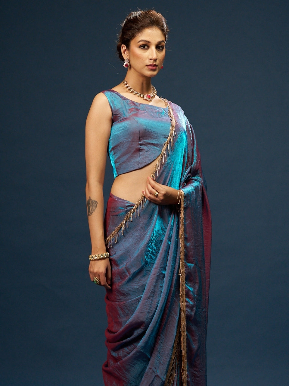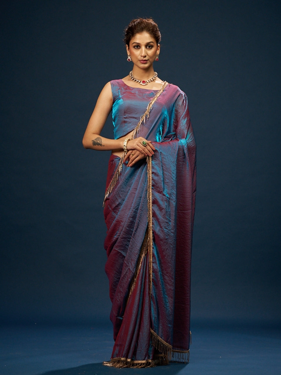 Radiate Grace with Our Bluish Lilac Dual Tone Soft Satin Saree
