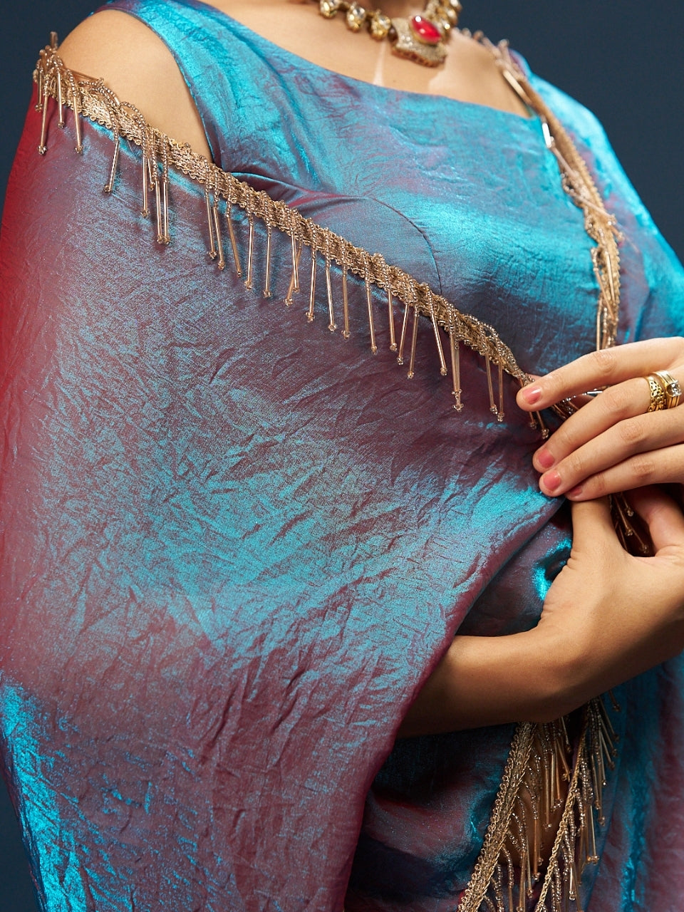 Step into the spotlight with our mesmerizing Bluish Lilac Dual Tone Soft Satin Saree, a luxurious blend of softness and shimmer. Designed to turn heads, this saree features a serene bluish-lilac dual-tone finish that flows beautifully with every step. The highlight lies in its heavy cut danna lace border, adding a rich, handcrafted look, while latkan tassels bring an extra touch of flair to your drape.