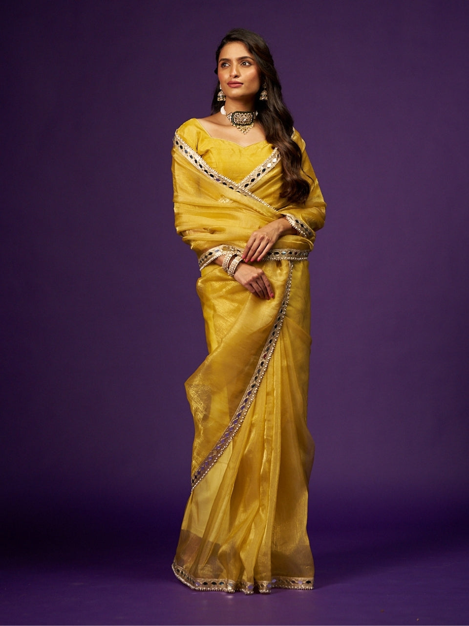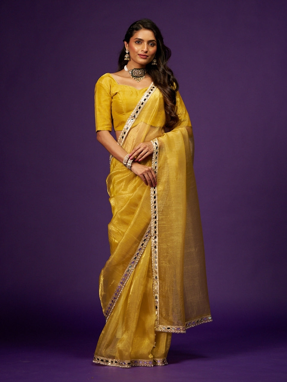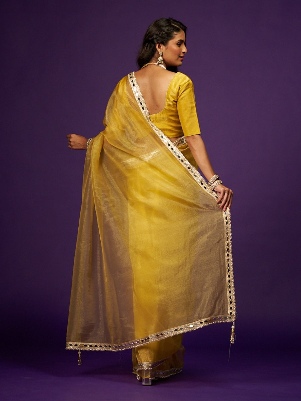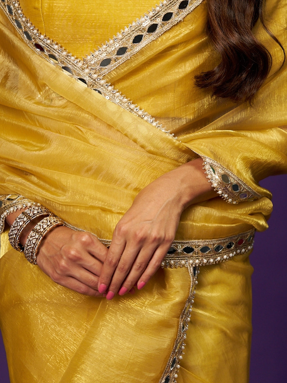 Brass Yellow Tissue Saree with Mirror & Moti Lace
