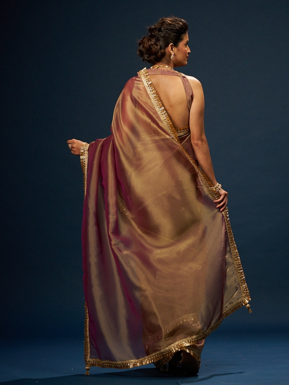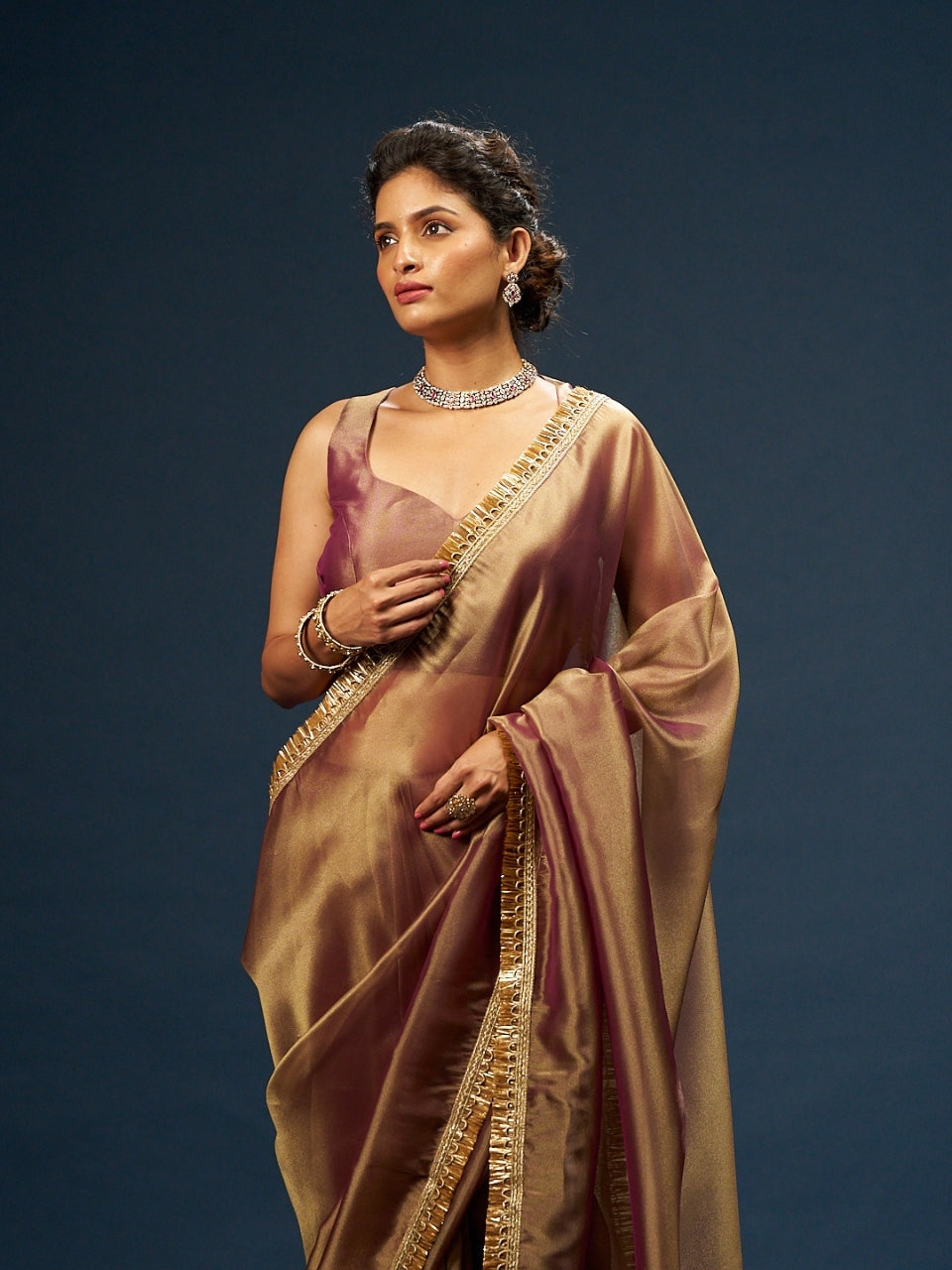 Embrace Sheer Elegance with Our Rose Dust Gold Pink Organza Saree