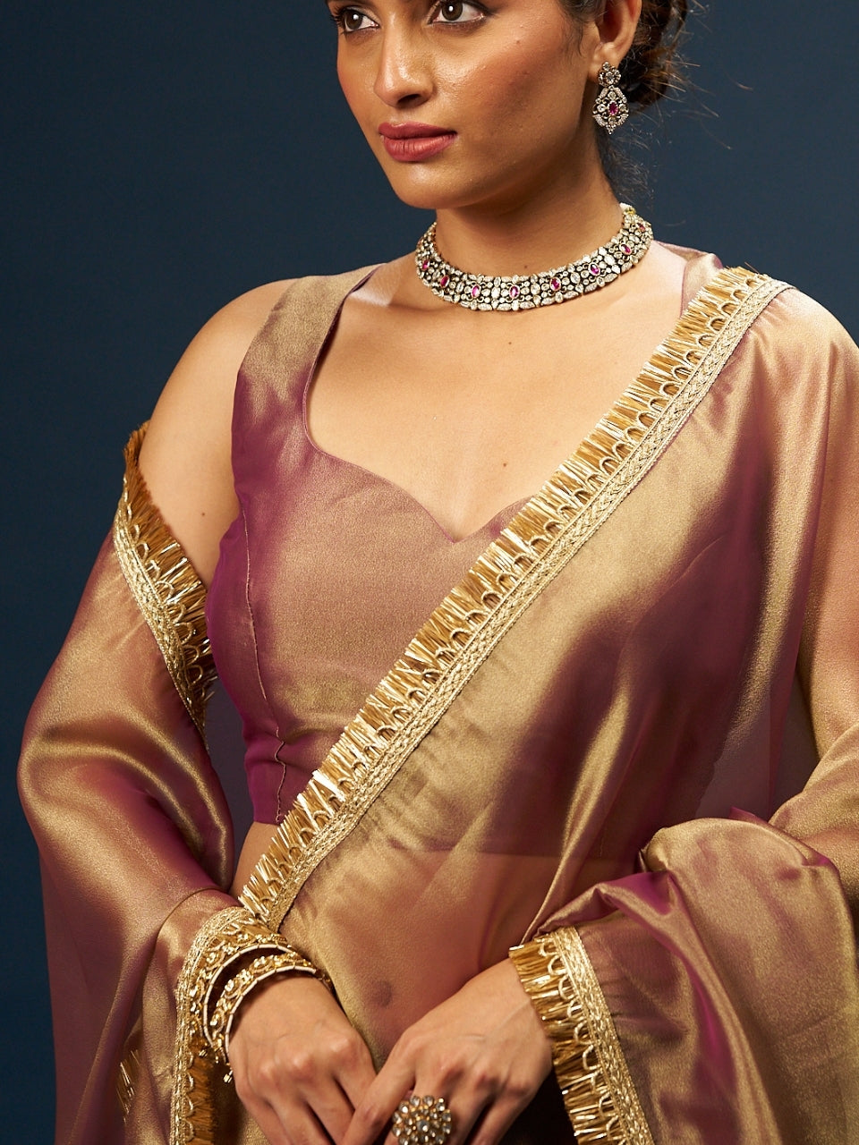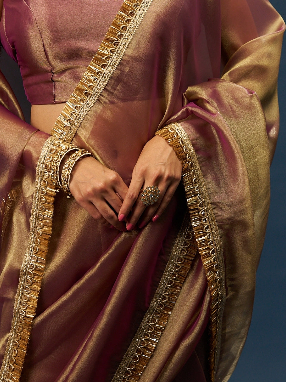 Rose Dust Gold Pink Organza Saree with Zari Border